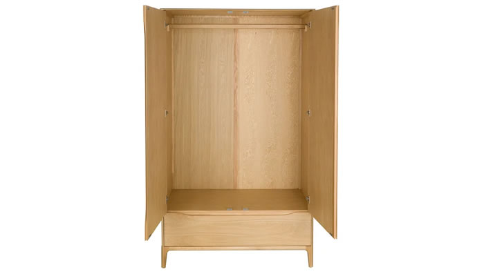 Ercol Rimini Wardrobe 2 Door The ercol Rimini 2 door wardrobe has generous storage space for hanging clothes plus a deep drawer to the base. Contemporary and elegant, highlighting the distinctive grain of the light oak.