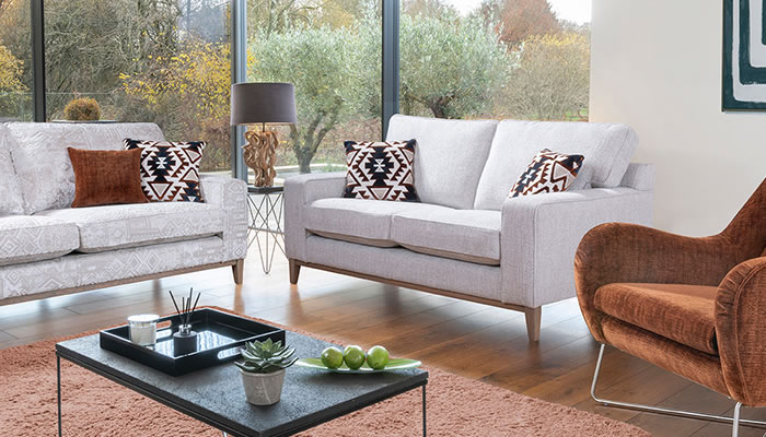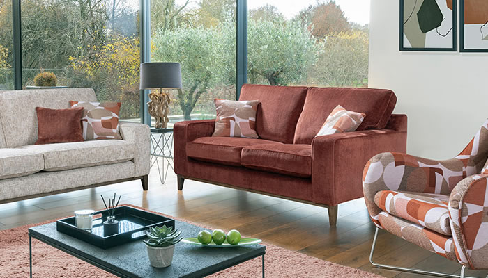 Alstons Fairmont 2 Seater Sofa The Alstons Fairmont two seater sofa has a modern urban twist is available in a range of textured chenille plains mixed with geometric scatters and a choice of weathered or dark oak plinth and feet.