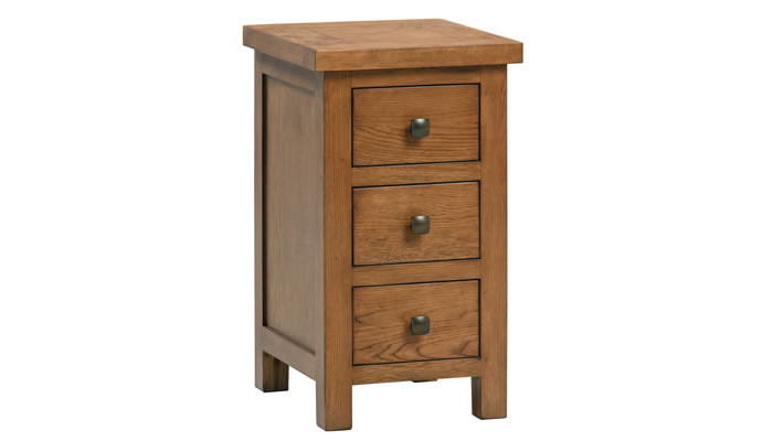 Dorridge Rustic Oak Bedroom Compact 3 Drawer Bedside This Dorridge compact 3 drawer bedside is perfect when space is limited but you still need that extra surface beside the bed and small amount of on-hand storage. The Dorridge traditional rustic oak range has dovetail drawers and stylish panels with clean straight lines. Finished in a protective dark rustic lacquer and a modern square metal knob.
