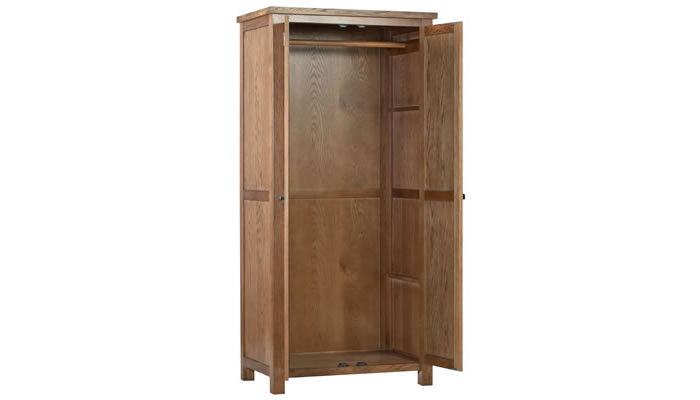 Dorridge Rustic Oak Bedroom Double Wardrobe This Dorridge all-hanging double wardrobe is perfect for full-length clothing items and is built to last, with a single full-width hanging rail. The Dorridge traditional rustic oak range has dovetail drawers and stylish panels with clean straight lines. Finished in a protective dark rustic lacquer and a modern square metal knob.