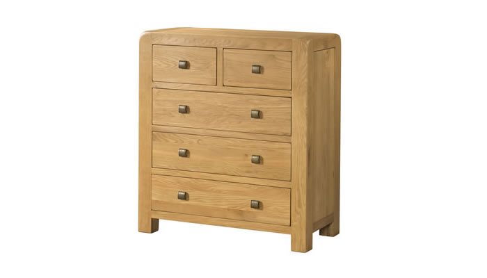 Daventry Bedroom 3 Over 3 Chest The Daventry 2 over 3 chest of drawers is a staple in any bedroom for that extra bit of style and storage. Our quirky contemporary Daventry Oak Collection is functional, high quality and durable. This range offers dovetailed joints, clean straight lines, round corners and finished in a warm-toned contemporary wax and rustic knobs.