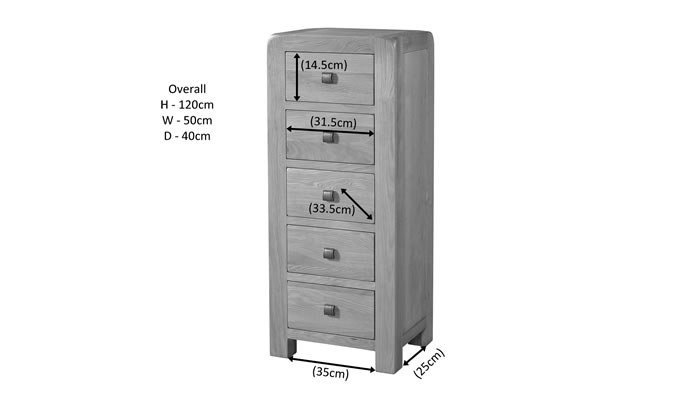 Daventry 5 Drawer Tall Chest This 5 drawer tall chest is designed to maximize height, offering substantial storage in a slim footprint, making it ideal for smaller rooms. This contemporary line integrates functionality with exceptional quality and durability, tastefully coated in a warm-toned modern wax.