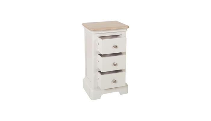 Leamington Painted 3 Drawer Compact Bedside The Signature Collection Leamington painted 3 drawer compact bedside is perfect to fit beside a bed where space is limited and is available in grey mist or white.