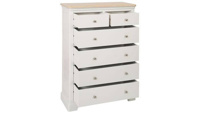 Leamington Painted Bedroom 2 Over 4 Chest The Signature Collection Leamington Painted 2 Over 4 Chest has soft curves and a light paint finish that will bring style and warm to any bedroom. Offering storage over 4 large drawers and 2 smaller drawers, this chest offers the perfect storage combination. The good size top surface area can be used for a lamp, mirror, TV, books and more.