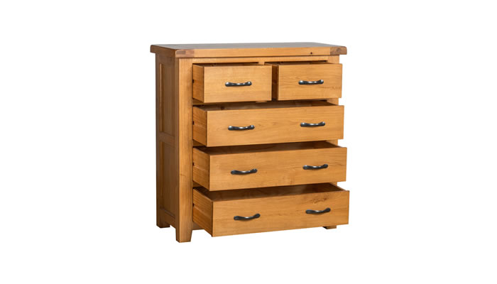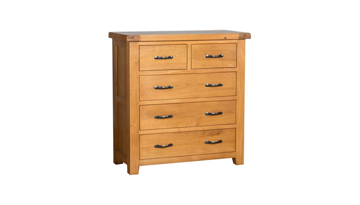 Southam Bedroom 3 + 2 Chest The Signature Collection Southam 3 + 2 Chest is made from white oak, chunky top with softened corners, tapered legs, dovetailed drawers and supplied with a rustic pull handle.