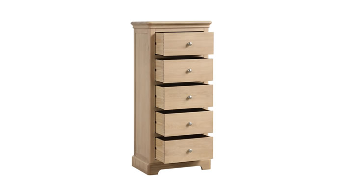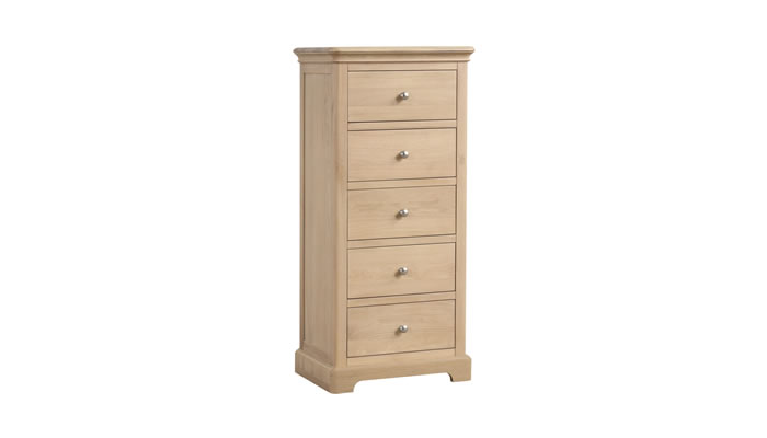 Leamington Oak Bedroom 5 Drawer Wellington The Signature Collection Leamington Oak 5 Drawer Wellington is made from white oak, pine and MDF. Finished in a protective pale oak lacquer and a choice of brushed metal or wooden knobs.