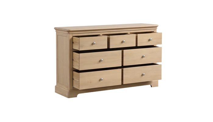Leamington Oak Bedroom 3 Over 4 Chest The Signature Collection Leamington Oak 3 Over 4 Chest is made from white oak, pine and MDF. Finished in a protective pale oak lacquer and a choice of brushed metal or wooden knobs.