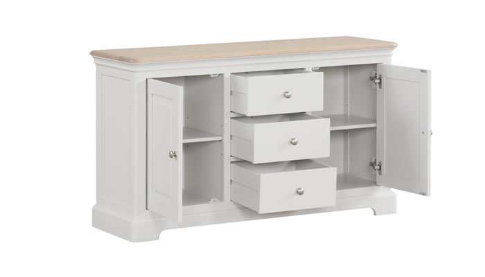 Leamington Painted 2 Door 3 Drawer Sideboard The Leamington two door three drawer sideboard in grey mist paint combines clean, modern design with a charming country twist perfect for any living or dining space. It offers generous storage behind two smooth closing doors and three generous drawers.