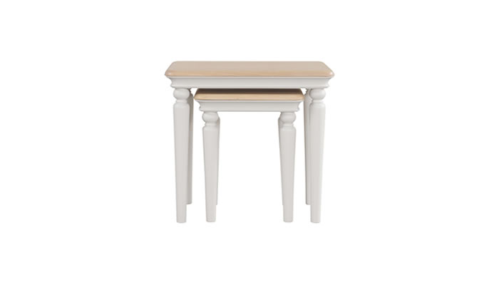 Leamington Painted Nest of 2 Tables The Leamington nest of two tables in grey mist paint are beautifully crafted with turned legs and solid oak tops. This nest of tables brings versatility and charm to your living area for serving drinks or creating extra surface space whenever you need it.